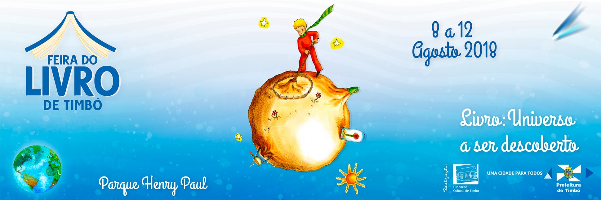 Espetáculos teatrais, contação de histórias, troca-troca de livros, apresentações musicais e de danças, oficinas, concursos, venda de livros e universo comics são algumas das atrações desta edição da Feira do Livro de Timbó. O tema da Feira do Livro deste ano traz como enfoque o grande autor Antoine de Saint-Exupéry que, com sua linguagem simples e tocante, arrebatou leitores em todo o mundo com a sua obra, completou Jorge Ferreira, presidente da Fundação Cultural de Timbó, referindo-se ao livro O Pequeno Príncipe.