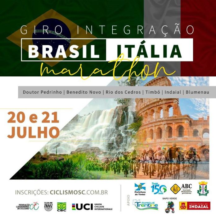 A Prefeitura de Timbó informa que nos dias 20 e 21 de julho, portanto no próximo final de semana, acontece a 1ª edição da prova de ciclismo Giro Integração Brasil Itália Maraton, para atletas amadores. O Percurso passará pelas cidades de Timbó, Doutor Pedrinho, Benedito Novo, Rio dos Cedros, Indaial e Blumenau. A realização e da Federação Catarinense de Ciclismo, Associação Blumenauense Pró-ciclovias, Associação Sapo Verde de Ciclismo e Famiglie Trentine, com apoio da Prefeitura de Timbó. Mais informações com roteiro, largadas, horários e inscrições no site: www.ciclismosc.com.br.