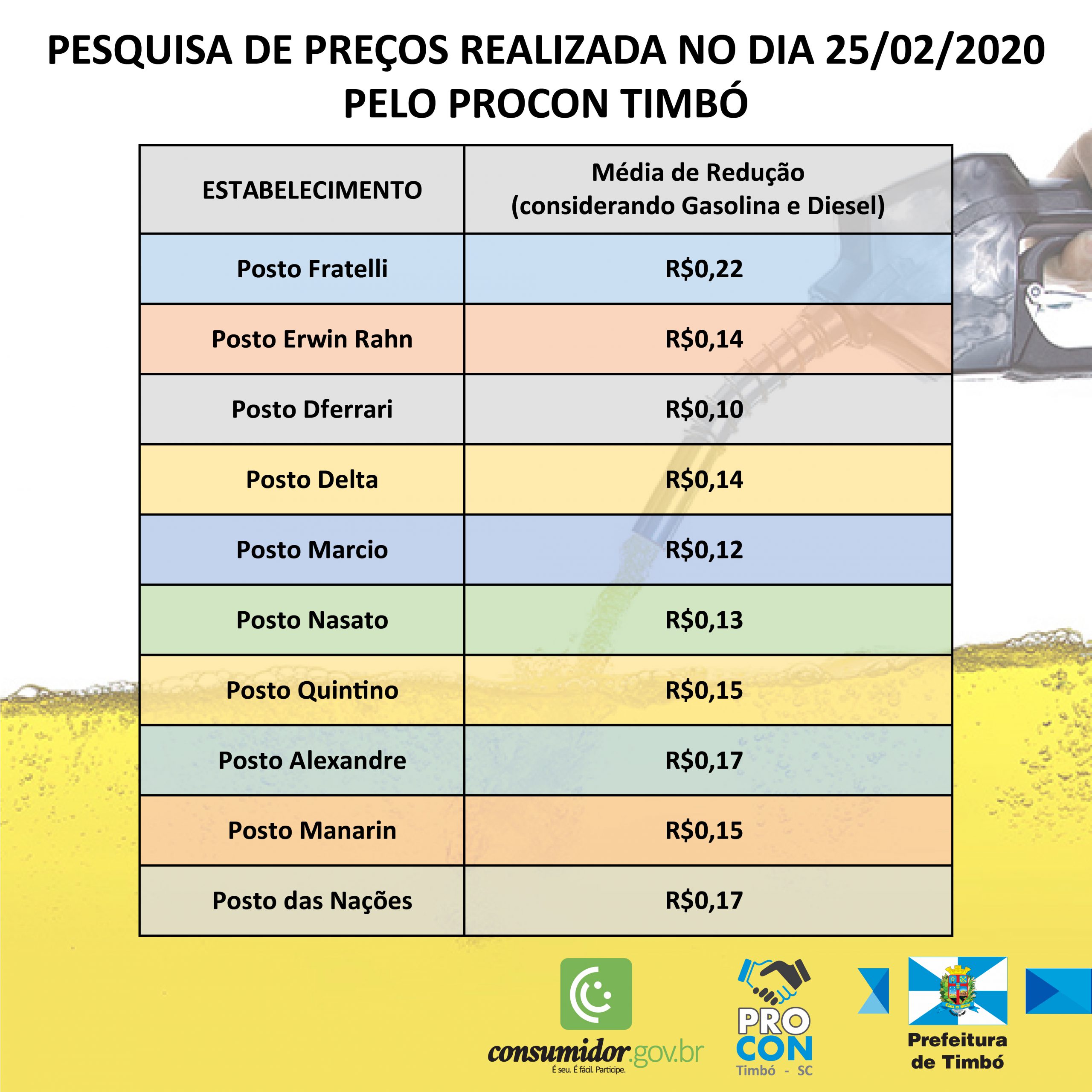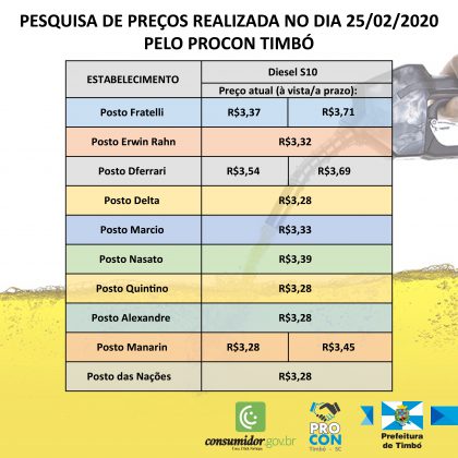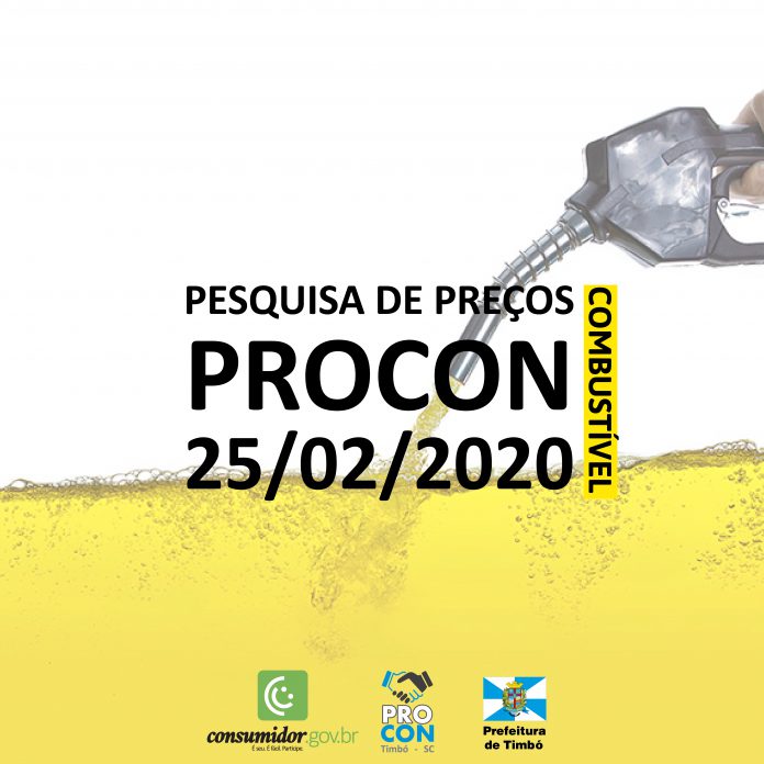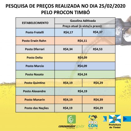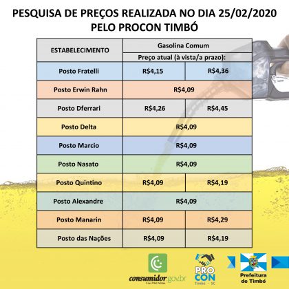 Foi divulgado pelo Procon de Timbó o levantamento dos preços de combustíveis no município. A pesquisa foi realizada nos 10 estabelecimentos que oferecem esse serviço na última semana, tendo como objetivo confirmar se houve reajustes e, caso haja, de quanto.