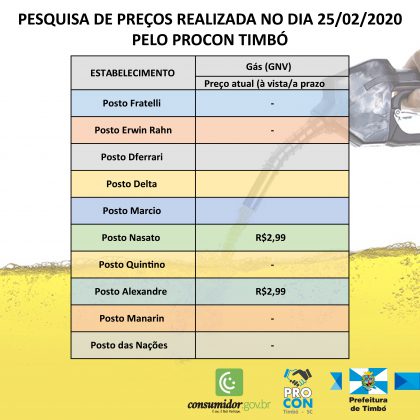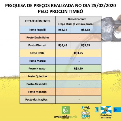 As tabelas informam os valores para pagamento à vista e, também, parcelado, apresentando as margens de variação em cada posto. A pesquisa compõe um banco de dados que estará disponível nas redes sociais e site oficial da Prefeitura e Procon, e pessoalmente no Procon Timbó.