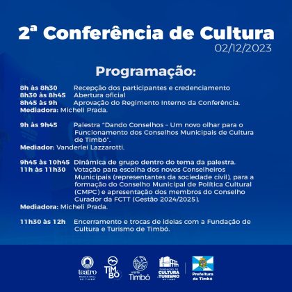 A abertura será com a palestra de Vanderlei Lazzarotti, com o tema “Dando Conselhos – Um novo olhar para o Funcionamento dos Conselhos Municipais de Cultura de Timbó”. E logo após, serão eleitos os novos membros do Conselho Municipal de Política Cultural (CMPC). Confira a programação completa abaixo.