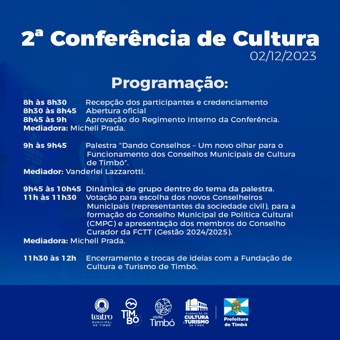 Neste sábado, dia 02 de dezembro, a Fundação de Cultura e Turismo de Timbó realiza a 2ª Conferência de Cultura do município. O evento é aberto a toda comunidade e acontece no Centro Integrado de Cultura Ingo Germer, das 8h às 12h.