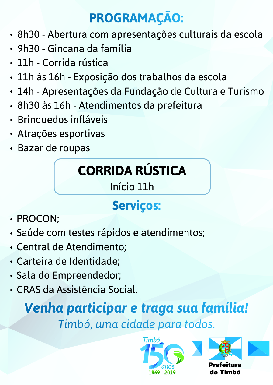 A corrida rústica, sempre uma atração à parte, terá início às 11h com a participação de alunos, pais, professores e comunidade em geral. Durante o evento também será realizado o bazar de roupas. E a comunidade poderá ainda tirar dúvidas e encaminhar processos com os atendimentos da Sala do Empreendedor, Central de Atendimento, Carteira de Identidade e Assistência Social.