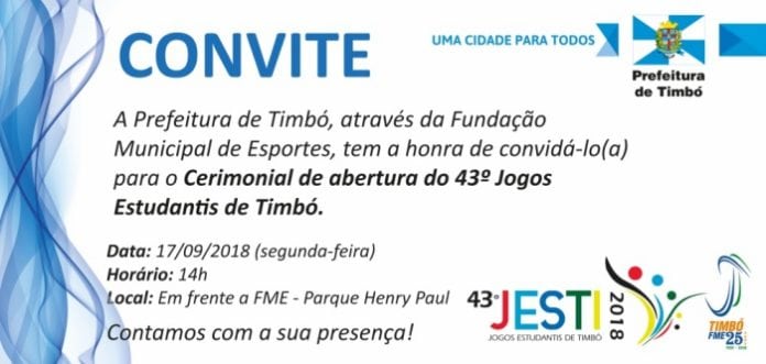 De 17 de setembro a 05 de outubro acontece a 43ª edição dos Jogos Estudantis de Timbó JESTI. A abertura será na segunda-feira (17) às 14h, em frente a Fundação Municipal de Esporte, FME Timbó, no Parque Henry Paul. Alunos de 14 escolas públicas e privadas da cidade participam da competição, divididos em três categorias: 11 a 13 anos, 14 e 15 anos, 16 a 18 anos.