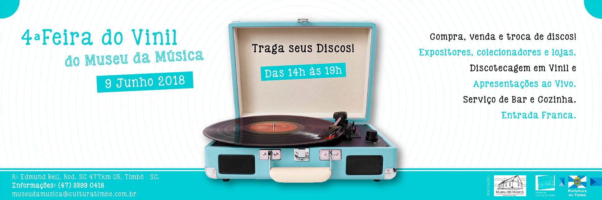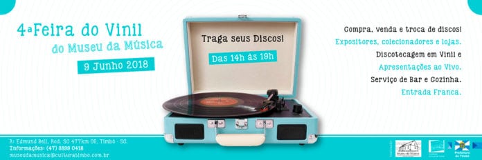 Exposição, compra, venda e troca de discos, discotecagem em vinil e música ao vivo. Estas são algumas das atrações da 4ª Feira do Vinil, que acontece no Museu da Música de Timbó no dia 09 de junho, a partir das 14h. Expositores e colecionadores de várias cidades trarão seus LPs (Long-Play, ou discos de vinis, se preferir) para apreciação dos amantes da música de outrora, em um dos principais eventos culturais de Timbó.