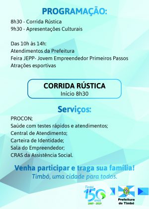 O evento inicia às 8h30 e seguirá com atividades até as 14h. Uma das atividades de destaque será a corrida rústica, que inicia às 8h30. O público também poderá prestigiar apresentações culturais a partir das 9h30.