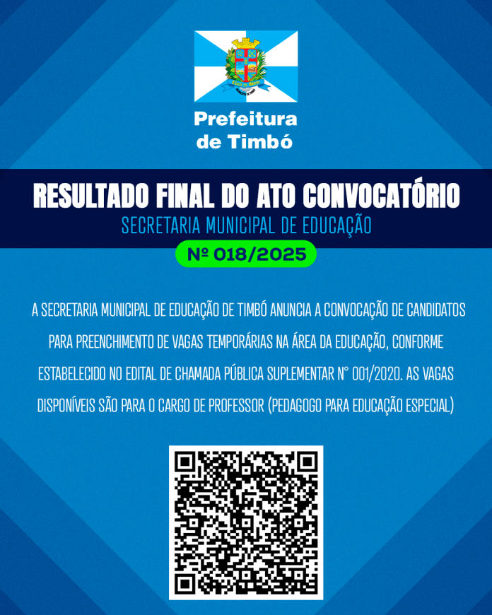 Para mais informações, acesse o edital completo no site da Prefeitura de Timbó (www.timbo.sc.gov.br)