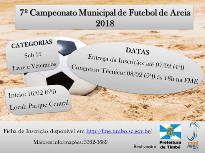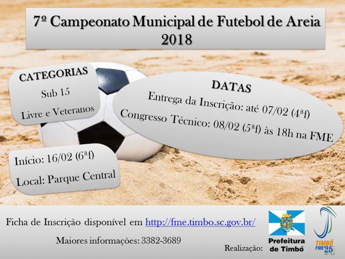 Estão abertas as inscrições para o 7º Campeonato Municipal de Futebol de Areia 2018. O campeonato acontece em três categorias: Livre, Veteranos e Sub15. Para a categoria Livre os atletas deverão ter nascidos em 2002 (idade mínima).