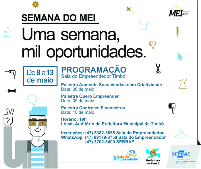 Estão abertas as inscrições para as pessoas que querem participar das palestras da Semana do Microempreendedor Individual, de 8 a 13 de maio. As inscrições podem ser feitas na própria Sala do Empreendedor, anexo à Prefeitura de Timbó, ou pelos telefones 3382-3655 da Prefeitura, 3702-6400 do SEBRAE ou pelo whatsapp da Sala do Empreendedor no número 99179-8758. Serão ministradas três palestras, todas no auditório da Prefeitura, às 19h, no dia 8 com o título Aumente suas Vendas com Criatividade, dia 9 Quero Empreender e dia 10 de maio a palestra Controles Financeiros. A Semana do Microempreendedor Individual é uma promoção da Prefeitura de Timbó, através da Sala do Empreendedor, em parceria com o Sebrae.