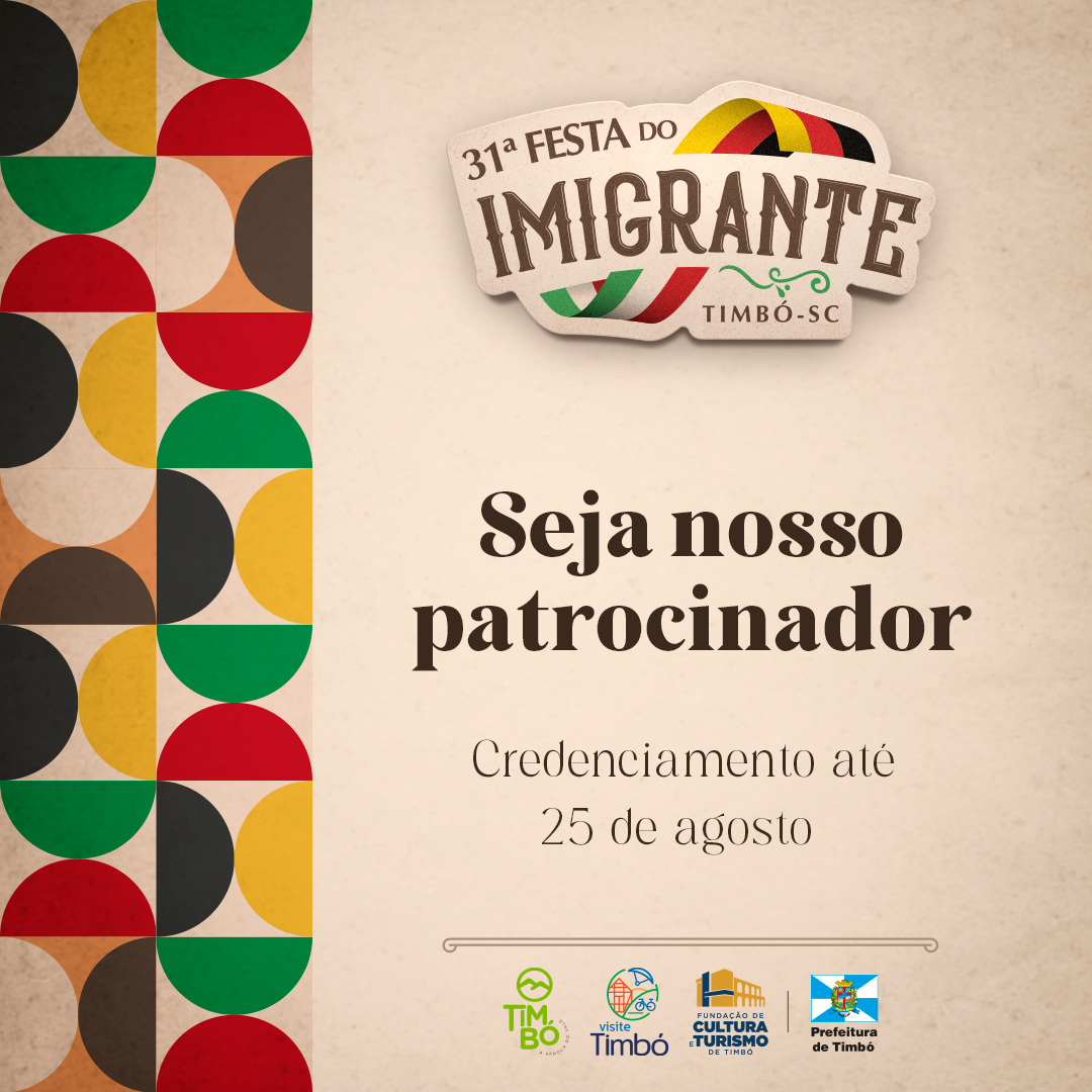 A Prefeitura de Timbó, através da Fundação de Cultura e Turismo, informa que está aberto o edital de credenciamento para cotas de patrocínio na 31ª Festa do Imigrante, que acontece de 29 de setembro a 01 de outubro e de 06 a 12 de outubro.
