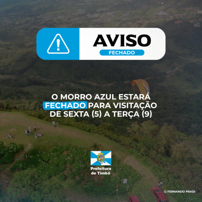 A Prefeitura de Timbó informa que entre os dias 5 e 9 de fevereiro, sexta até terça-feira, o acesso ao Morro Azul estará interditado devido às obras de pavimentação no topo do morro. Não haverá também possibilidade de usar o camping nesse período. A partir de quarta-feira, dia 10, o parque volta a ser aberto normalmente.