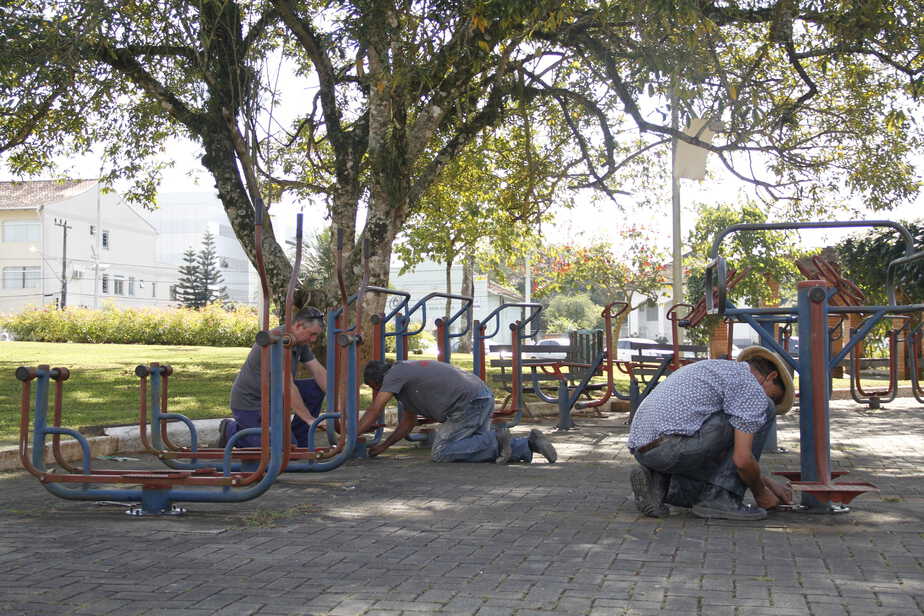 A Prefeitura de Timbó iniciou hoje o conserto dos aparelhos de ginástica e dos playgrounds de parques e praças do município. No local, placas de sinalização serão colocadas alertando população.