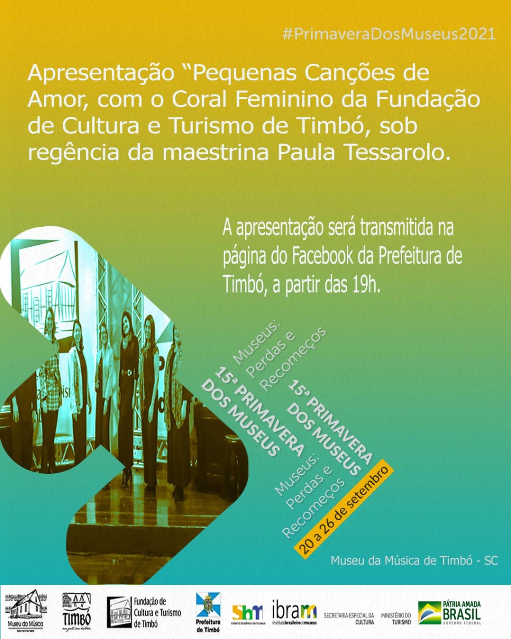No domingo, dia 26 de setembro, acontece a apresentação “Pequenas Canções de Amor”, com o Coral Feminino da Fundação de Cultura e Turismo de Timbó (FCTT). A apresentação encerra a programação da 15ª Primavera dos Museus no município, promovida no Museu da Música.