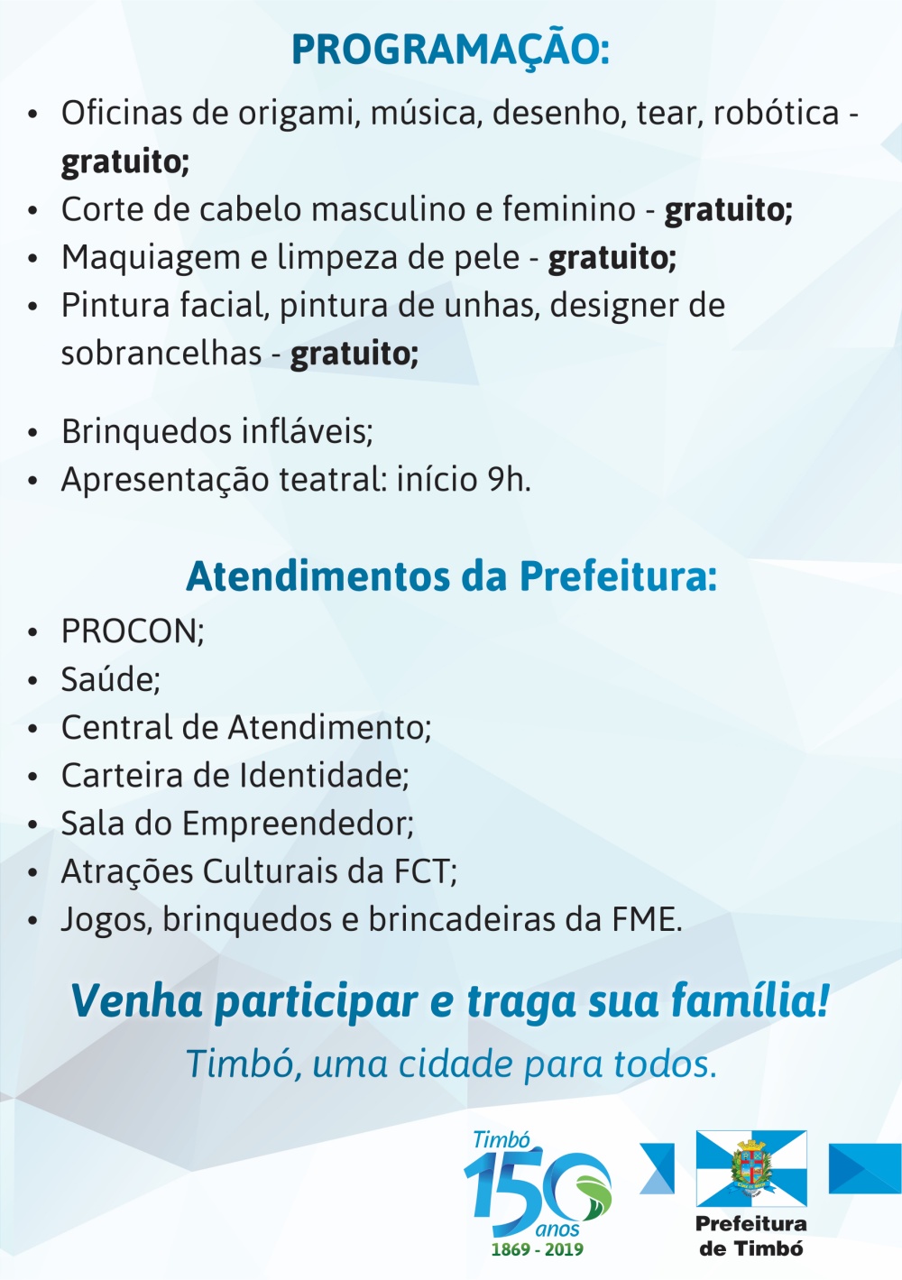 O Programa visa descentralizar os serviços prestados pela administração pública municipal e será desenvolvido sempre em unidades escolares do município. Nesta primeira edição a programação será voltada aos moradores do Bairro Araponguinhas, e entre as atrações estão: oficinas de origami, música, desenho, tear e robótica, cortes de cabelo, maquiagem, limpeza de pele, pintura de unhas, designer de sobrancelha, brinquedos infláveis, pintura facial para as crianças, e apresentação teatral a partir das 09h.