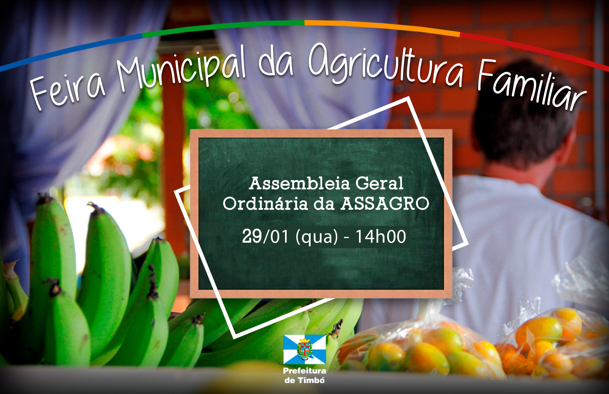 A ASSAGRO – Associação do Agronegócio de Timbó – convida seus associados para participar da Assembleia Geral Ordinária para eleger a nova diretoria e também para deliberar sobre outros assuntos pertinentes. Ela acontece no dia 29 de janeiro de 2020, às 14h, em primeira chamada e às 14h15min em segunda chamada, nas dependências da nova feira municipal, anexo ao prédio da antiga Sociedade Recreativa e Cultural, atrás do Parque Central de Timbó.