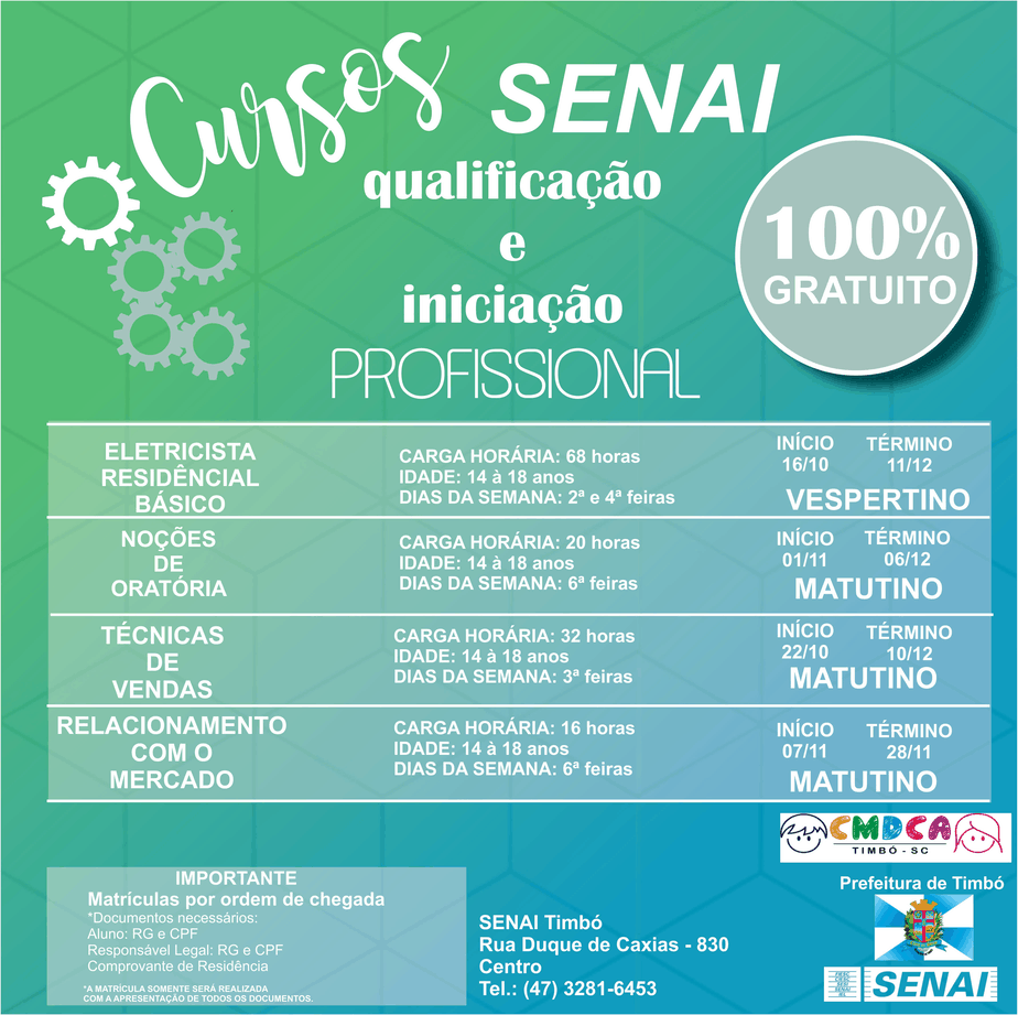 Mais informações no Senai Timbó, localizado no CET – Centro Empresarial de Timbó, na Rua Duque de Caxias, 830, no Centro, telefone 3281-6453, ou na Assistência Social do município, anexo à Prefeitura de Timbó.