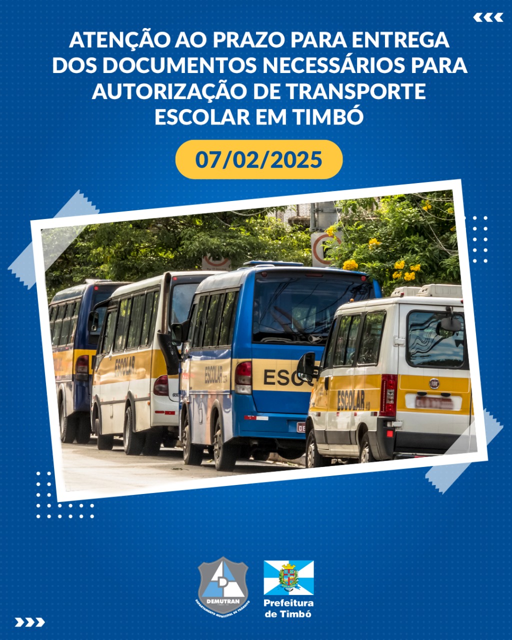 A Prefeitura de Timbó e o DEMUTRAN solicitam que todos os que realizam o transporte escolar que ainda não entregaram a documentação necessária para autorização do transporte, entreguem o quanto antes no Simplifica Timbó.
