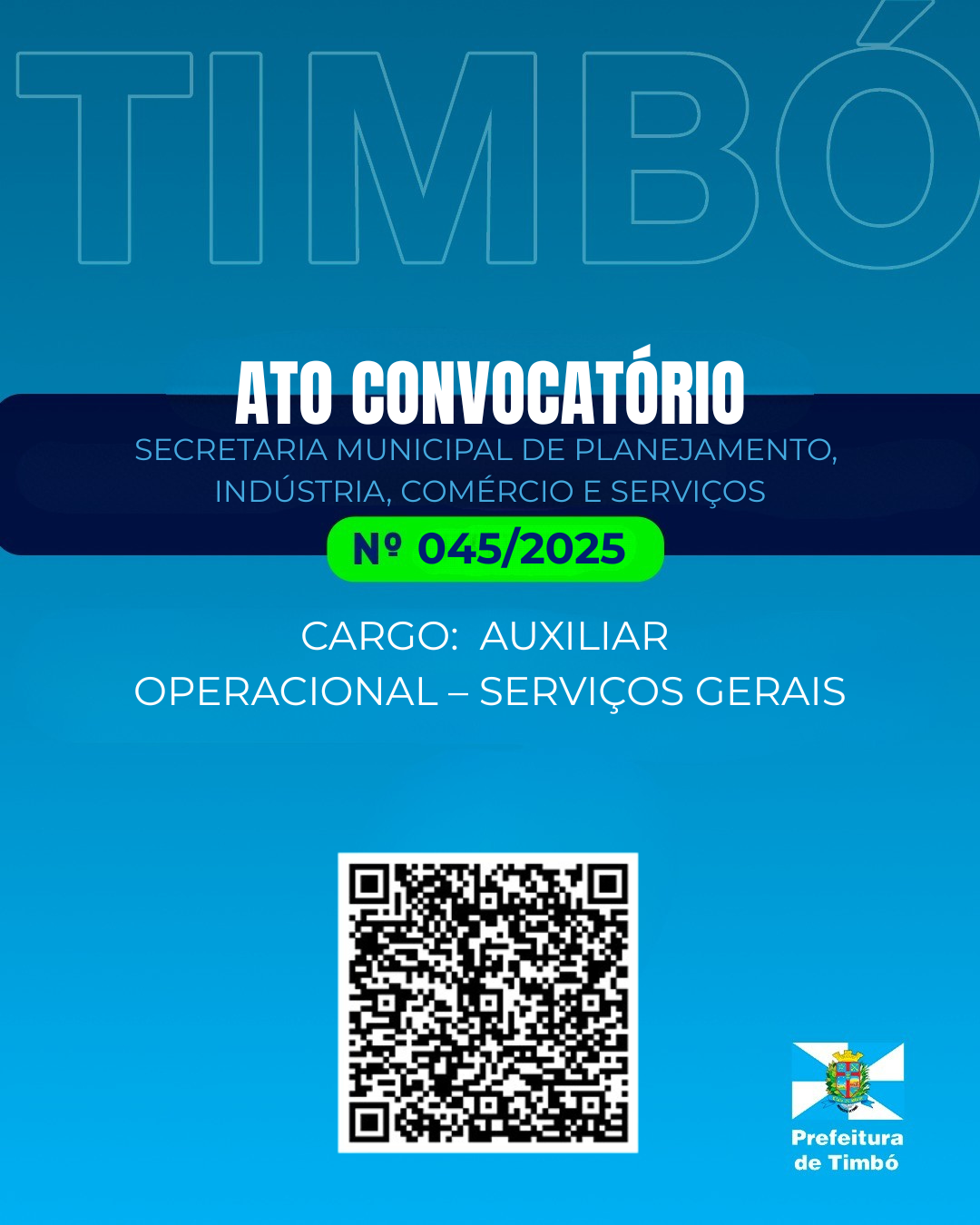 A Secretaria Municipal de Planejamento, Indústria, Comércio e Serviços de Timbó anuncia a convocação de candidatos para o preenchimento de vaga temporária, conforme estabelece o Ato Convocatório nº 045/2025, vinculado ao Edital de Chamada Pública Suplementar nº 03/2024.