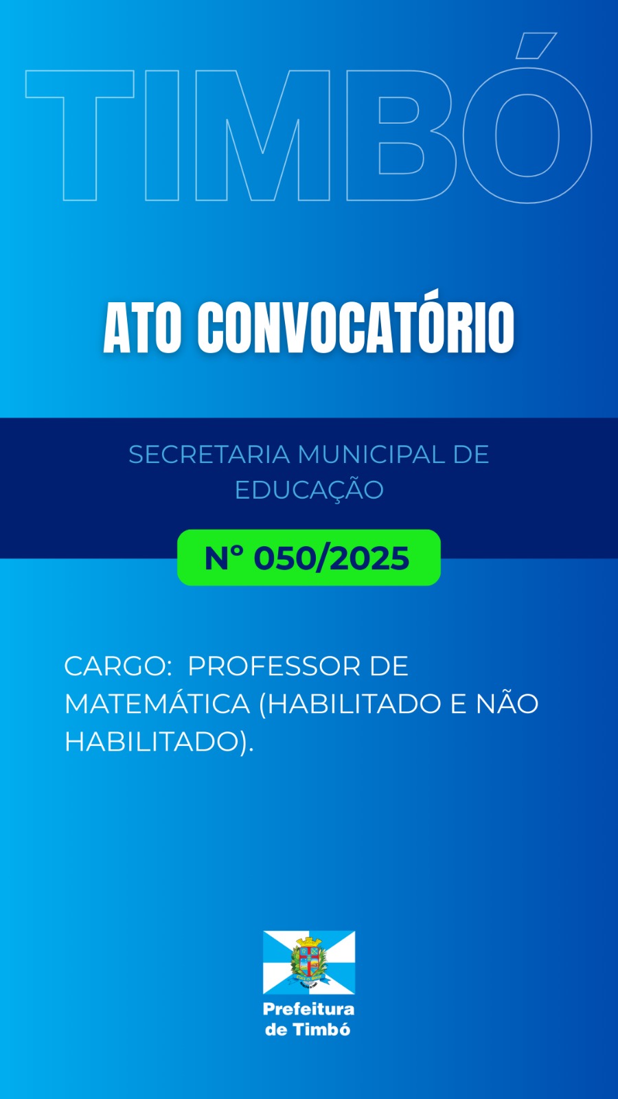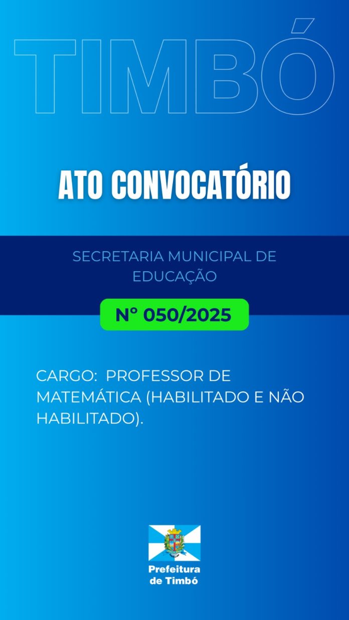 A Secretaria Municipal de Educação de Timbó divulgou o Ato Convocatório nº 050/2025, vinculado ao Edital de Chamada Pública Suplementar nº 02/2020, para o preenchimento de vagas temporárias de Professor de Matemática no Ensino Fundamental.