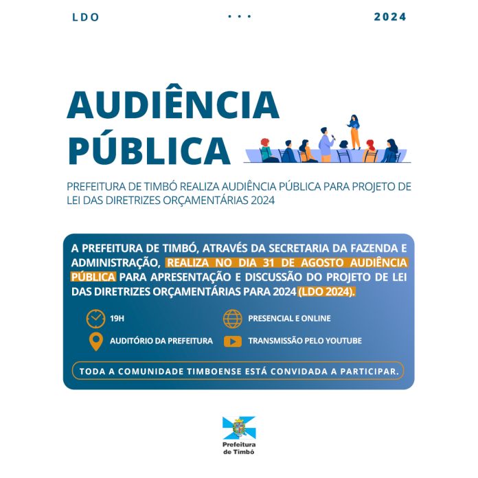 Na próxima quinta-feira, dia 31 de agosto, a Prefeitura de Timbó, através da Secretaria da Fazenda e Administração, realiza Audiência Pública para apresentação e discussão do Projeto de Lei das Diretrizes Orçamentárias para 2024 (LDO 2024). Toda a comunidade timboense está convidada a participar.