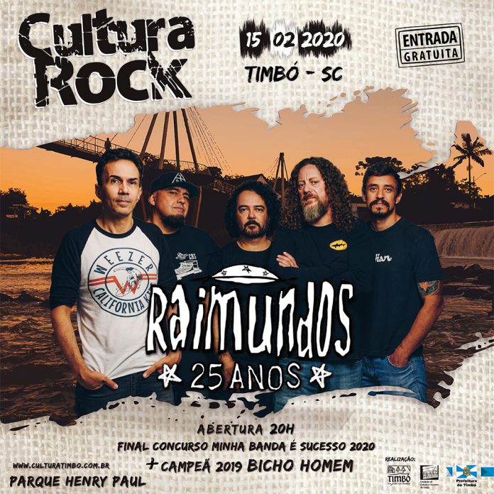 Já estamos escutando baquetas esquentando, guitarras solando e os sucessos de 25 anos da banda brasiliense Raimundos ecoando pelo Pavilhão de Eventos Henry Paul. Está chegando o Cultura Rock 2020, que promete para o dia 15 de fevereiro muita animação e rock n’ roll rolando solto a partir das 20 horas. Importante lembrar que todas as atrações do Cultura Rock são gratuitas, inclusive o show nacional que fecha a noite.
