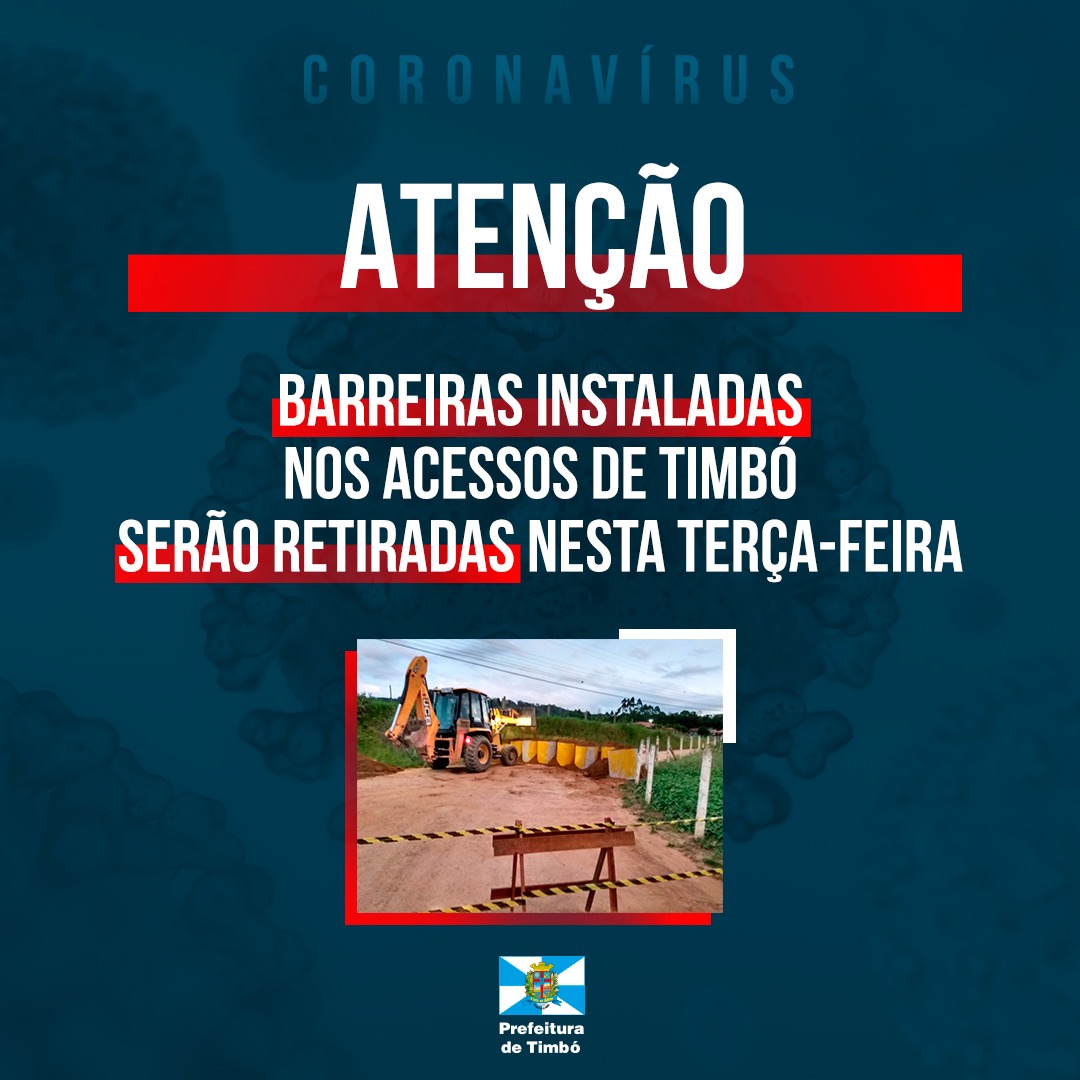 De acordo com a decisão tomada pela Prefeitura de Timbó na última sexta-feira (27), durante reunião do prefeito Jorge Kruger com o colegiado de secretários, as barreiras instaladas em alguns dos acessos ao município serão todas retiradas até às 18h desta terça-feira (31).