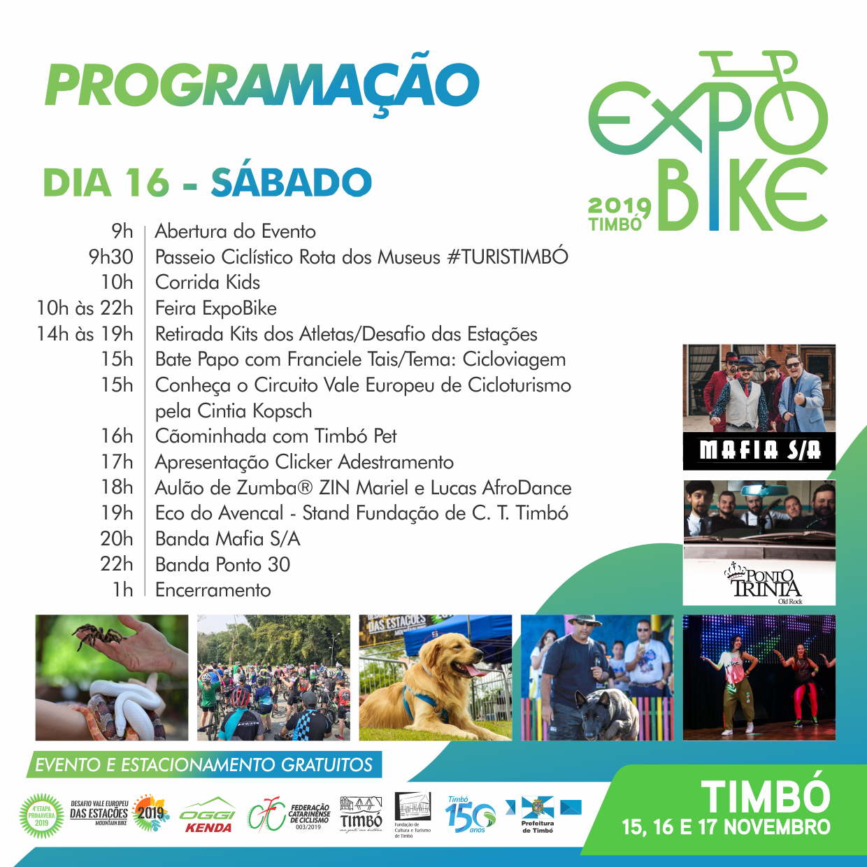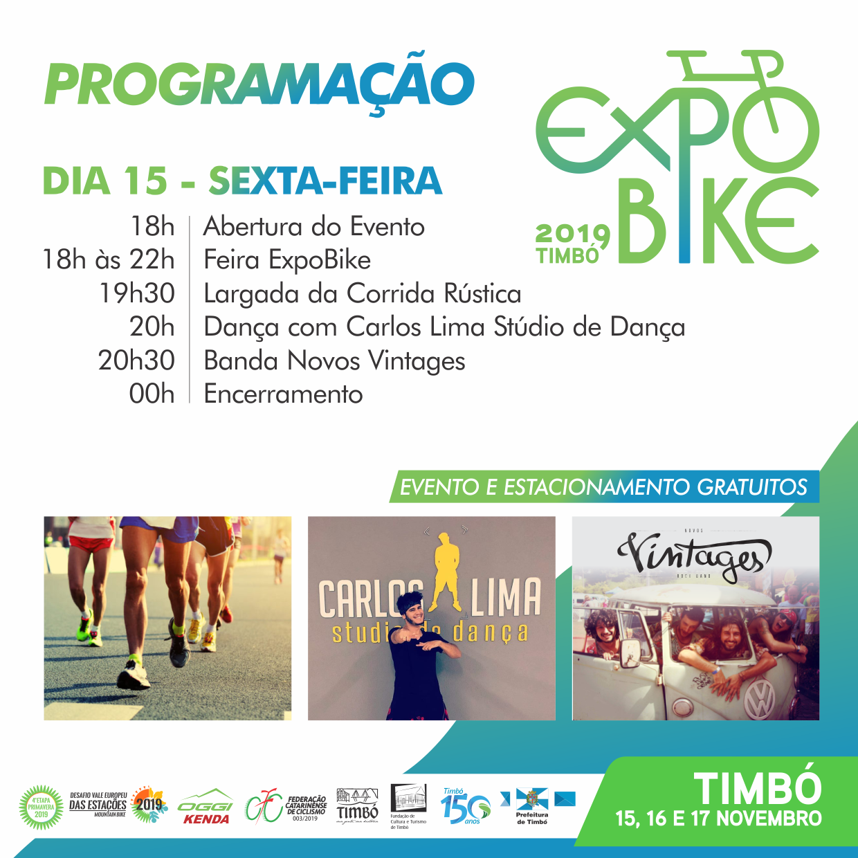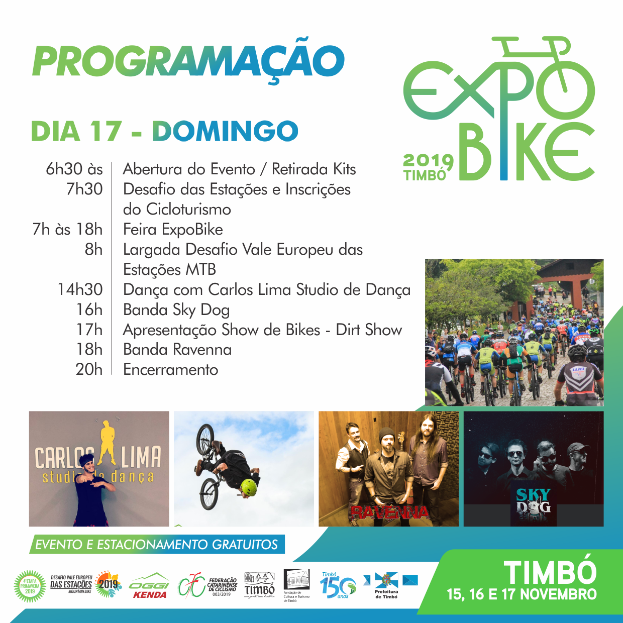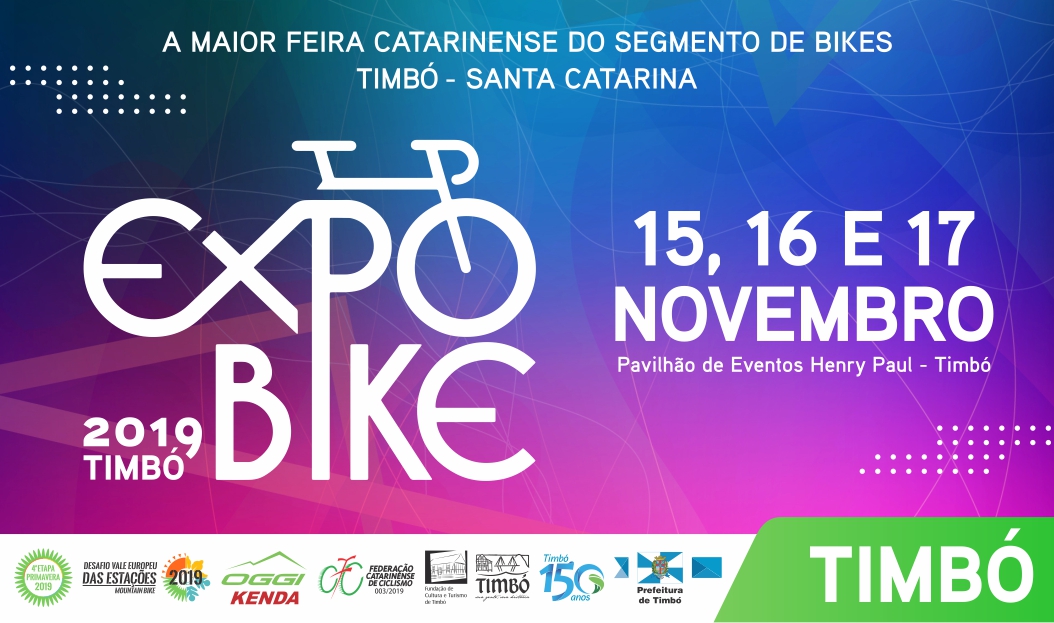 Os amantes do pedal têm um compromisso em Timbó nos dias 15, 16 e 17 de novembro, com a maior feira catarinense do segmento de ciclismo, a ExpoBike 2019, realizada no Pavilhão de Eventos Henry Paul. Durante a programação, a partir das 8 horas de domingo, está prevista a largada para a 4ª etapa do Desafio Vale Europeu das Estações de Ultramaratona de Mountain Bike. A abertura oficial acontece na sexta-feira, 15 a partir das 18 horas.