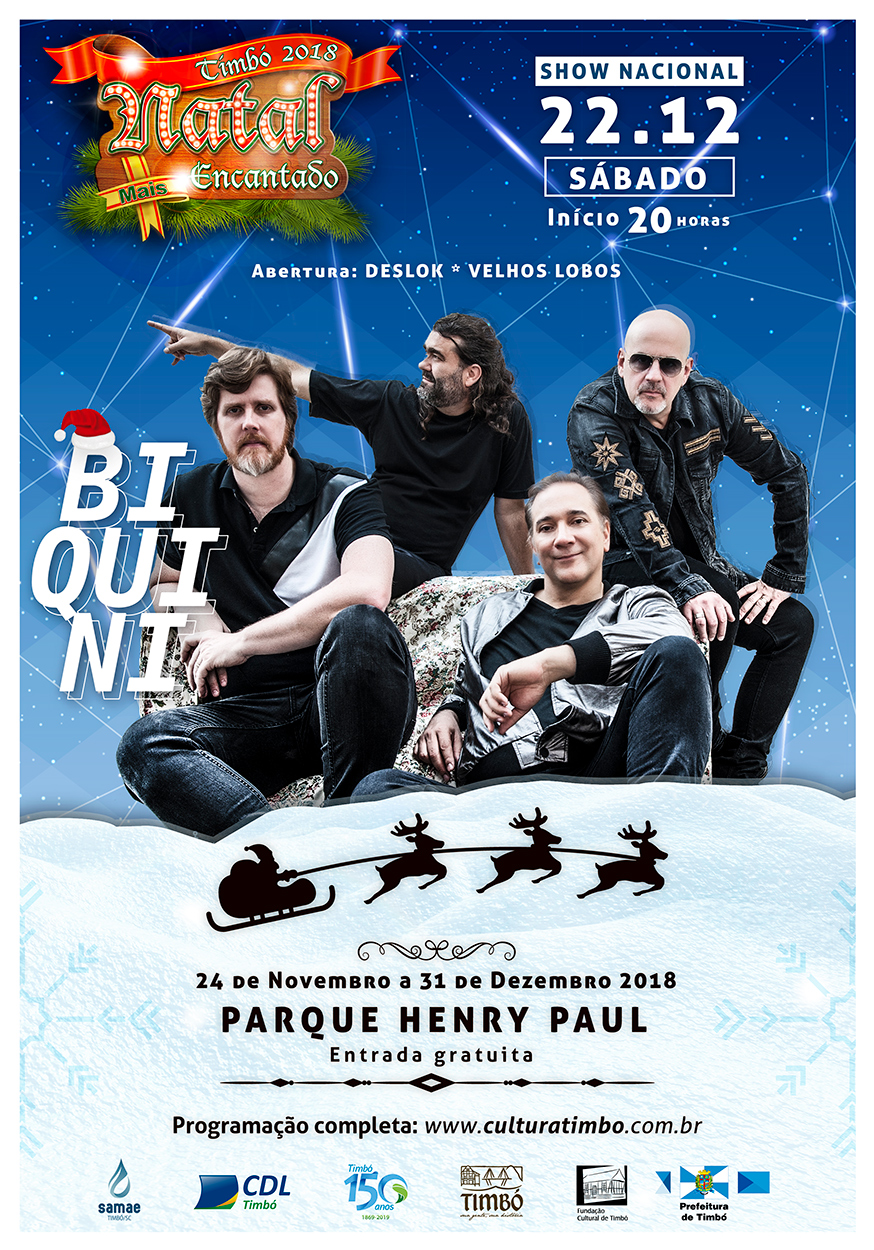 O show nacional do Biquini Cavadão é uma atração do Natal Mais Encantado de Timbó. O evento é promovido pela Prefeitura de Timbó, através da Fundação Cultural, e segue até o dia 31 de dezembro no Parque Henry Paul.