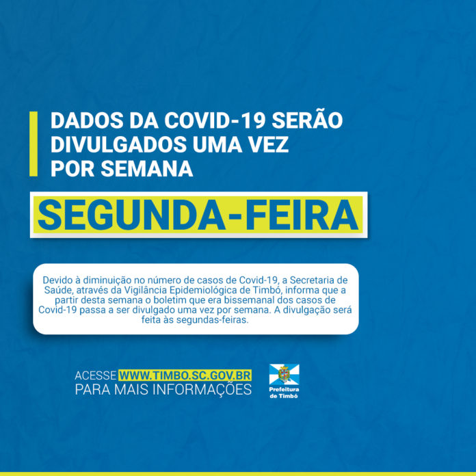 Devido à diminuição no número de casos de Covid-19, a Secretaria de Saúde, através da Vigilância Epidemiológica de Timbó, informa que a partir desta semana o boletim que era bissemanal dos casos de Covid-19 passa a ser divulgado uma vez por semana. A divulgação será feita às segundas-feiras.