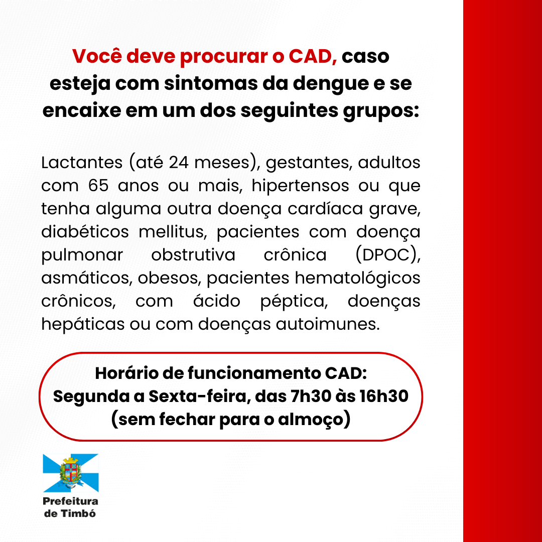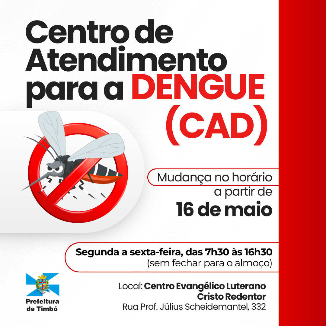 A Secretaria de Saúde de Timbó informa que a partir desta quinta-feira, dia 16 de maio, o Centro de Atendimento para a Dengue (CAD) voltará a atender somente até às 16h30.