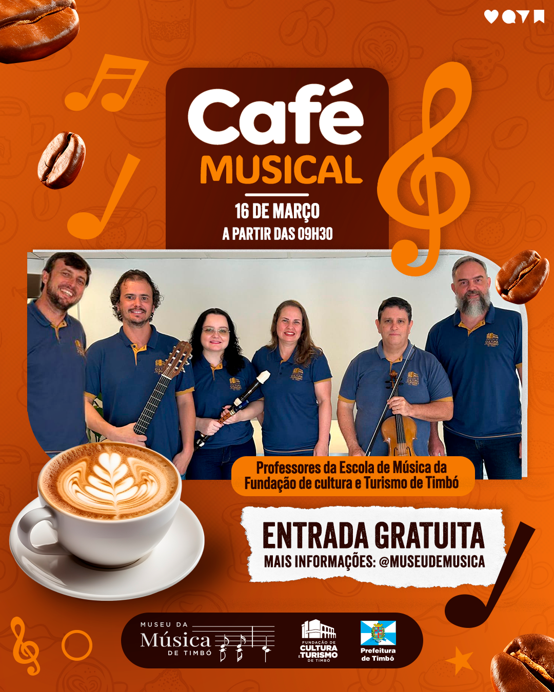 No próximo dia 16 de março, o Museu da Música será palco de mais uma edição do Café Musical, evento que trará como atração os talentosos professores de Música da Escola de Música da Fundação de Cultura e Turismo de Timbó (FCTT). Com início marcado para às 09h30, o público poderá desfrutar de um delicioso café da manhã e, a partir das 10h, acompanhar apresentações musicais.