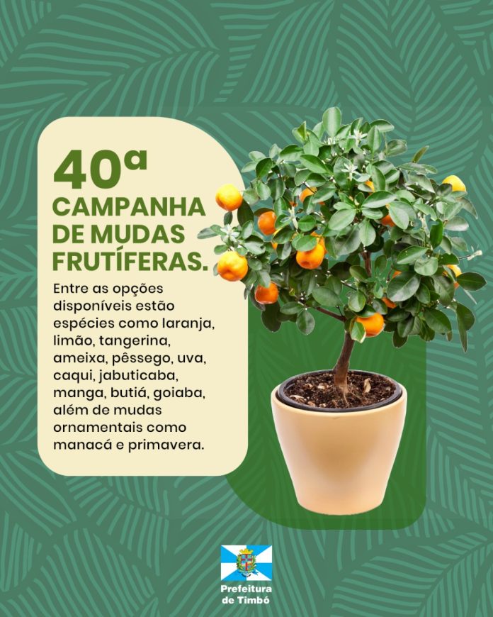 A tradicional Campanha de Mudas Frutíferas de Timbó chega à sua 40ª edição neste ano, reafirmando seu sucesso e relevância para os agricultores e a comunidade em geral. Realizada anualmente pela Prefeitura Municipal, com o apoio da Associação dos Servidores Públicos Municipais, a campanha oferece uma oportunidade acessível para o cultivo de frutíferas e plantas ornamentais.