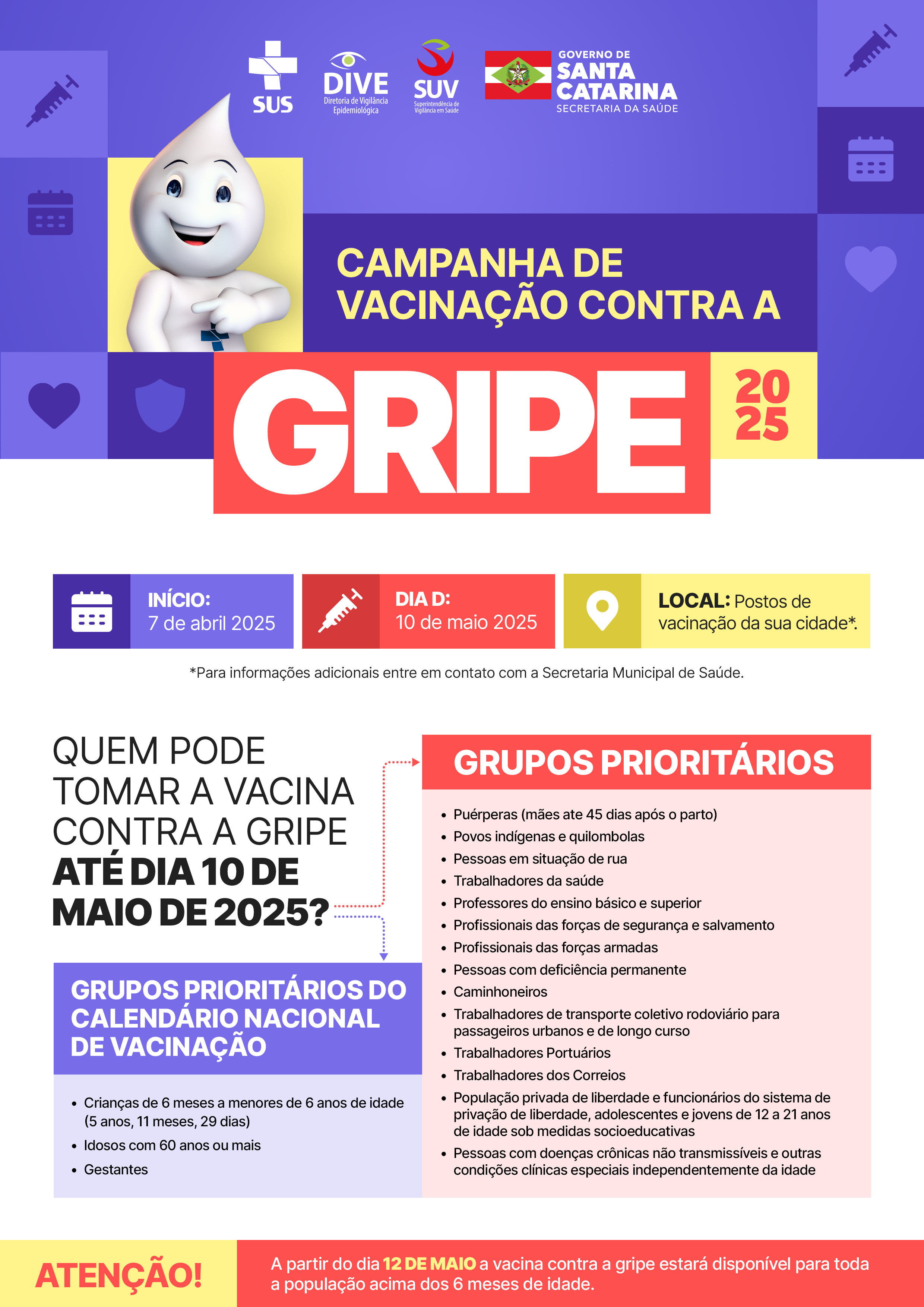 A vacinação é fundamental para a prevenção de complicações decorrentes da gripe, especialmente entre os grupos mais vulneráveis. A Secretaria de Saúde reforça o chamado para que todos os públicos prioritários procurem a unidade de saúde mais próxima e se imunizem.