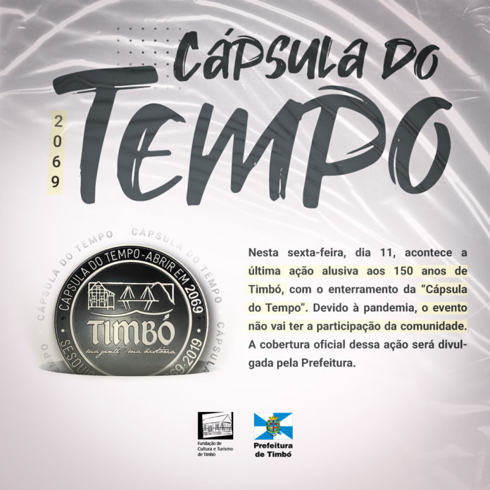 Nesta sexta-feira, dia 11 de dezembro, será realizada a última ação alusiva aos 150 anos de Timbó, celebrados em 2019, que é o momento onde o prefeito Jorge Kruger irá enterrar a “Cápsula do Tempo”, que representa o legado deixado pela comemoração do sesquicentenário da cidade e só será desenterrada e aberta em 2069.