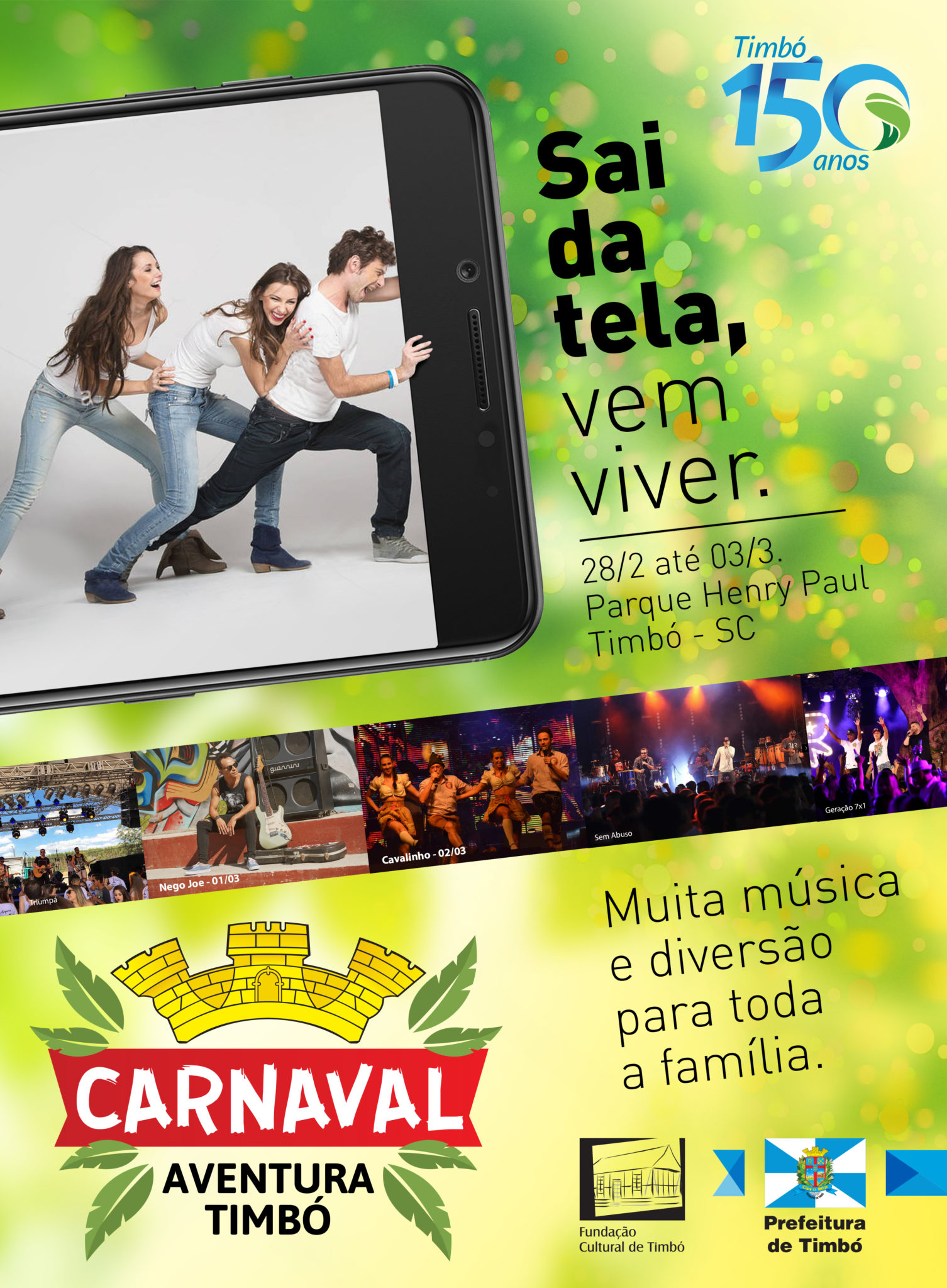 Faltam sete dias para o Carnaval Aventura Timbó 150 anos, evento que promete movimentar toda a região durante a próxima semana. O evento tem o apoio da Prefeitura de Timbó, por meio da Fundação Cultural, Fundação Municipal de Esportes e Secretaria Municipal de Educação, e acontece de 28 de fevereiro a 03 de março, no Parque Henry Paul, com o lema “Saia da tela e vem viver”. Serão mais de 20 atrações para toda a família, entre atividades radicais, de aventura e apresentações culturais. O destaque dessa edição fica por conta dos shows gratuitos com a Banda Cavalinho e Nego Joe.