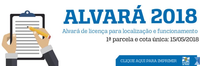 O Alvará de licença para localização e funcionamento é um documento obrigatório, que deve estar sempre exposto no estabelecimento, com as informações atualizadas. Quem não tem estabelecimento fixo, mas explora alguma atividade econômica, não está dispensado do licenciamento junto à Prefeitura, devendo também retirar anualmente seu alvará de funcionamento para respaldar o exercício de sua atividade em 2018.
