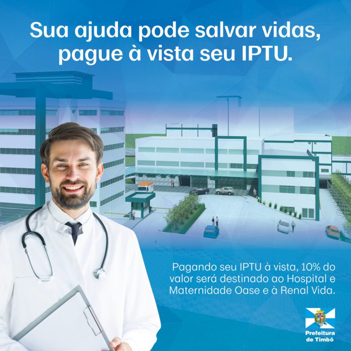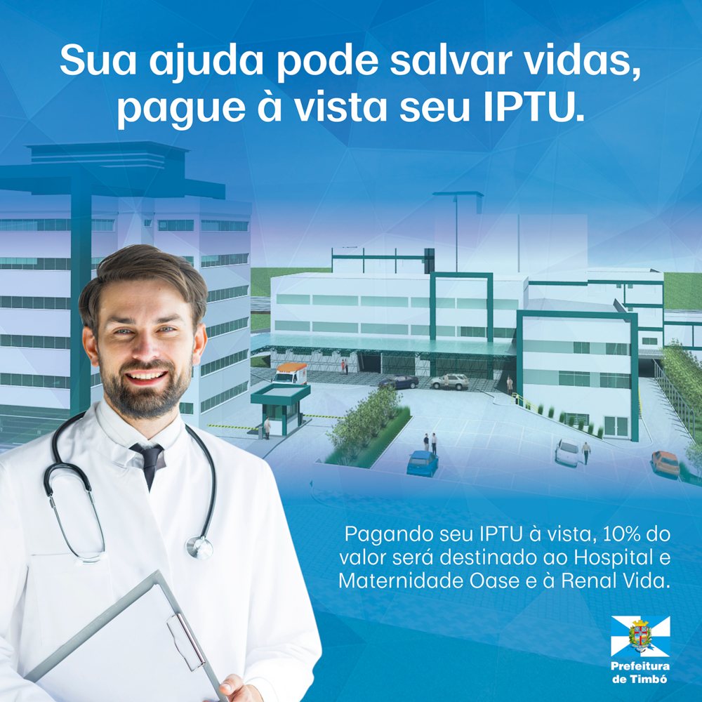 A campanha do IPTU este ano continua para duas causas muito importantes. O desconto de 10% dos pagamentos à vista será revertido metade para o Hospital e Maternidade OASE e para a Renal Vida, que também realiza um trabalho de excelência ajudando a salvar vidas e precisa da comunidade para dar início à construção de sua nova sede. A atual estrutura da Renal Vida já está pequena para atender com mais conforto e dignidade os pacientes que tanto sofrem com os problemas renais.