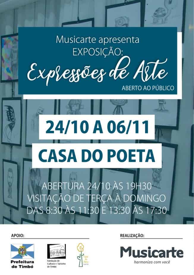 A Musicarte – escola de música e arte de Timbó, convida a todos para prestigiarem, no dia 24 de outubro, na Casa do Poeta Lindolf Bell, a abertura da exposição de seus alunos de artes, desenho e fotografia. A exposição tem como tema “Expressões de Arte” e busca apresentar as diversas técnicas aprendidas pelos alunos durante o ano.