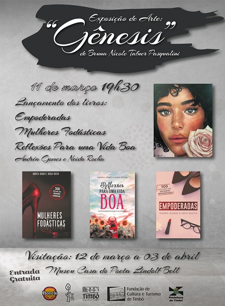 Dia 11 de março será de especial movimentação cultural no Museu Casa do Poeta Lindolf Bell. A partir das 19h30min, a temática feminina estará em alta com o lançamento de três livros das autoras Andréa Gomes e Neida Rocha: Mulheres Fodásticas, Empoderadas e reflexões para Uma Vida Boa. Paralelo a este ato, também estará sendo aberta a exposição “Gênesis”, da artista plástica Bruna Nicole Tafner Pasqualini. A entrada para o evento é gratuita e a visitação pública estará disponível de 12 de março a 3 de abril.