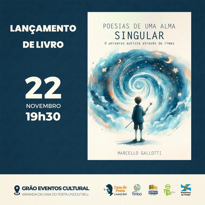 A Fundação de Cultura e Turismo de Timbó por meio do Museu Casa do Poeta Lindolf Bell tem a honra de convidar toda sociedade para prestigiar o lançamento do livro “POESIAS DE UMA ALMA SINGULAR – O Universo Autista Através de Rimas”, do escritor Marcello Gallotti. O evento acontece dia 22 de novembro, às 19h30, na Casa do Poeta.