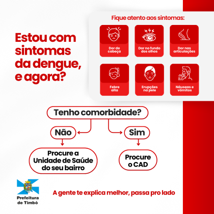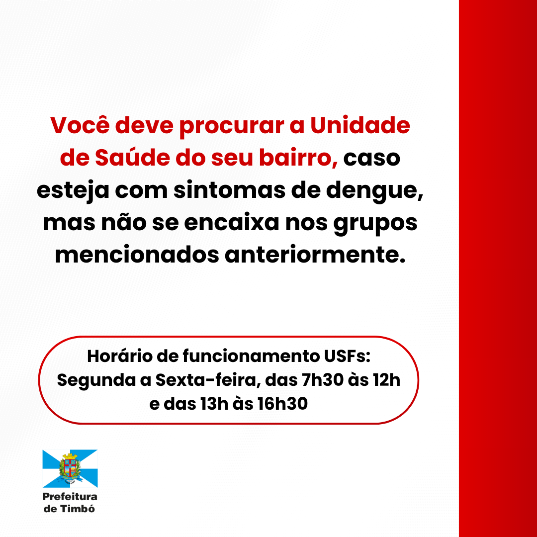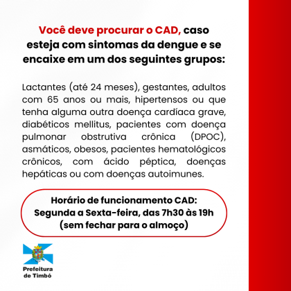 A Secretaria de Saúde de Timbó informa que a partir da próxima segunda-feira, dia 22 de abril, o Centro de Atendimento para a Dengue (CAD) terá seu horário de atendimento estendido até às 19h. O objetivo é que mais pessoas possam ser atendidas no local.