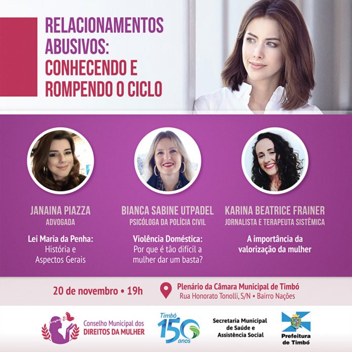 No dia 20 de novembro, quarta-feira, o Conselho Municipal dos Direitos da Mulher de Timbó, em parceria com a Prefeitura de Timbó através da Secretaria de Saúde e Assistência Social, convida a comunidade a participar do evento com o tema “Relacionamentos Abusivos: Conhecendo e Rompendo o Ciclo”, que será realizado no Plenário da Câmara Municipal, às 19h.