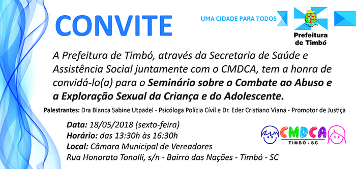 A Prefeitura de Timbó, através da Secretaria de Saúde e Assistência Social, juntamente com o CMDCA – Conselho Municipal dos Direitos da Criança e do Adolescente, promoverá no dia 18 de maio um Seminário sobre o Combate ao Abuso e a Exploração Sexual da Criança e do Adolescente. O encontro acontecerá no plenário da Câmara Municipal de Timbó, das 13h30 às 16h30.