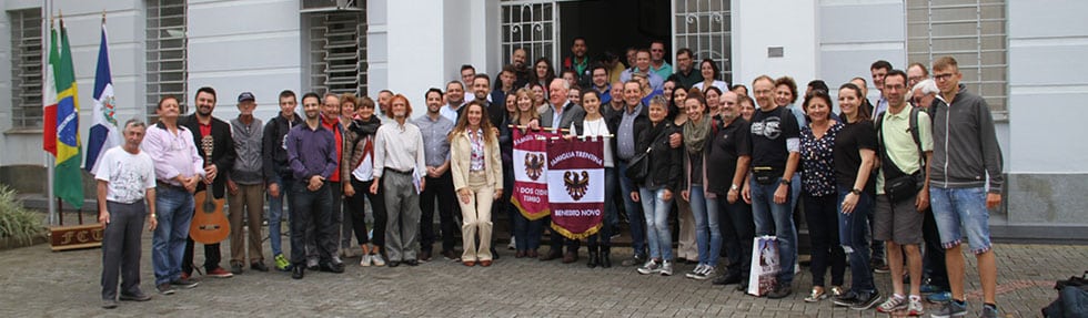 Uma simples e carinhosa solenidade em frente à Prefeitura de Timbó, na manhã desta quinta-feira, dia 17, marcou a passagem de uma comitiva italiana vinda da cidade de Fornace, da Província Autônoma de Trento, na Itália. Ao som do cantor Deco Dalponte, os amigos italianos foram recepcionados com aplausos, música italiana e palavras do Prefeito Jorge Kruger, que entregou a eles um livro de presente com informações da cidade.