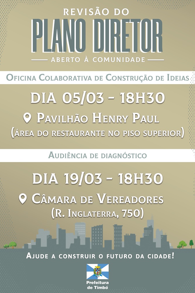 A revisão do Plano Diretor Municipal de Timbó entra em sua segunda etapa e para isso será realizada uma audiência pública em formato de Oficina Colaborativa de Construção de Ideias. O evento será no dia 05 de março, às 18h30min no Pavilhão de eventos Henry Paul (área do restaurante no piso superior). O evento é aberto e a participação da comunidade é fundamental para ajudar a construir os caminhos para o futuro de nossa cidade. Participar das audiências públicas é um ato de cidadania e dever social.
