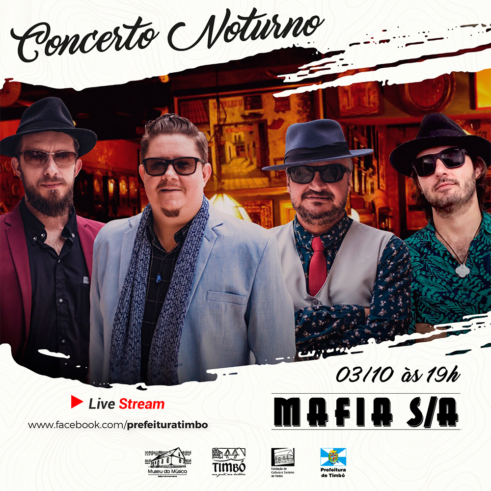 No domingo, dia 03 de outubro, ocorre a live do Concerto Noturno com a Banda Mafia S/A, promovido pela Prefeitura Municipal de Timbó e Fundação de Cultura e Turismo, através do Museu da Música. Esta edição será especial em comemoração ao Dia Internacional da Música, que é celebrado no dia 01 de outubro.