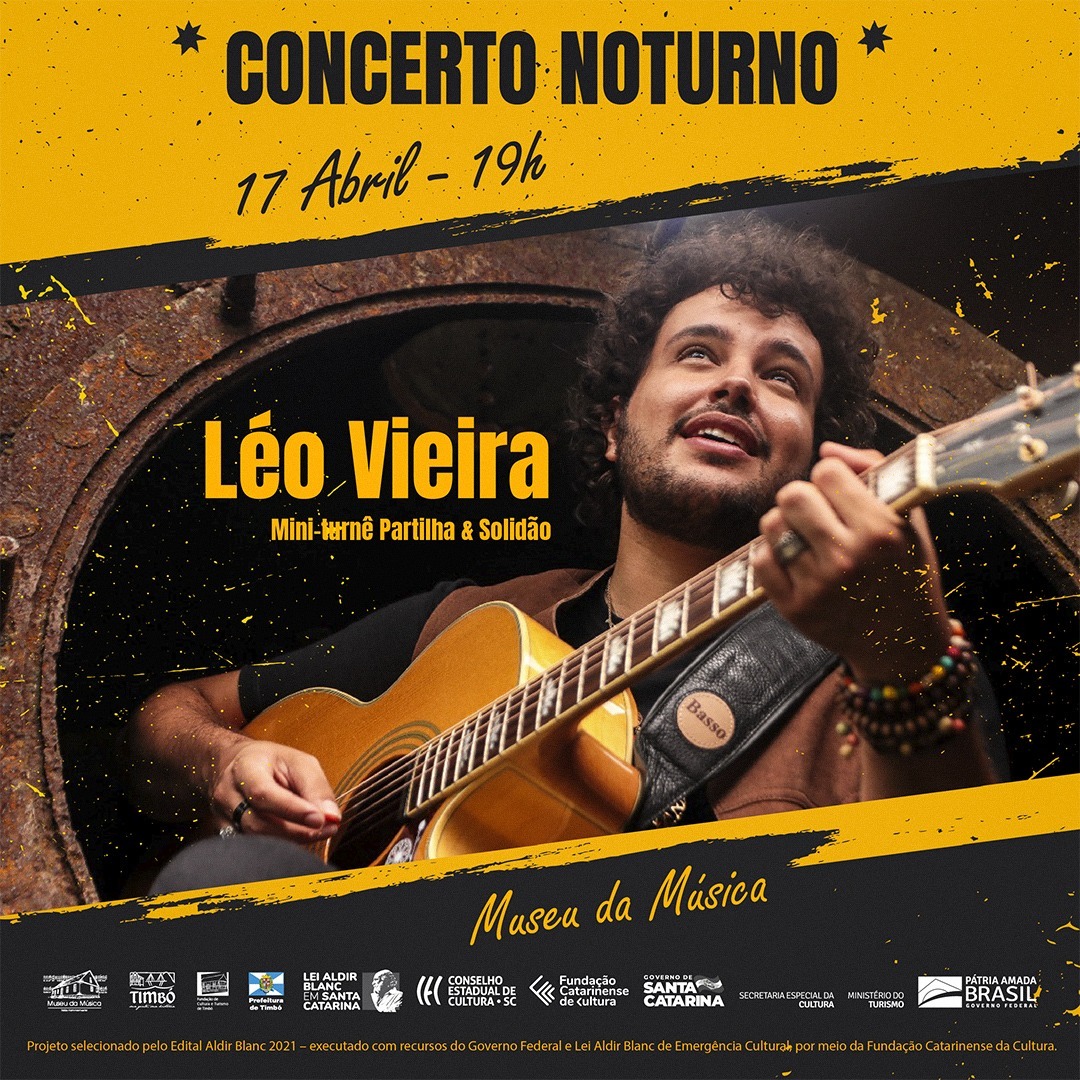 Neste domingo, dia 17 de abril, ocorre o Concerto Noturno com o projeto mini-turnê “Partilha & Solidão”, do cantor e compositor Léo Vieira. O Concerto Noturno é gratuito e acontece no Museu da Música, às 19h.