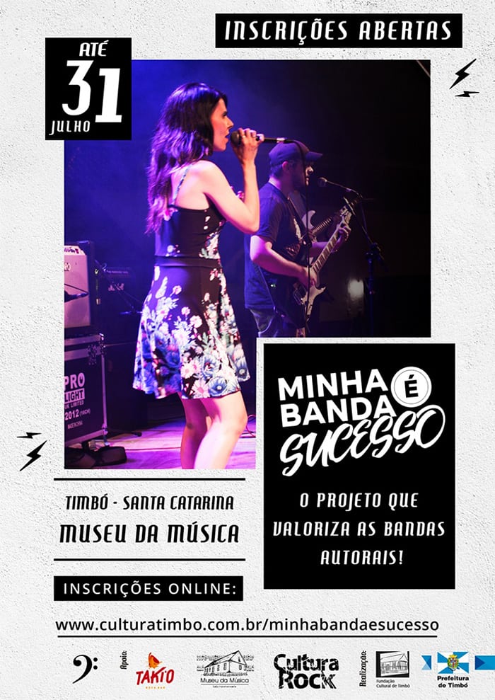 Já estão abertas as inscrições para a segunda edição do concurso Minha Banda é Sucesso, do Cultura Rock 2019. O concurso abre as portas para bandas autorais de todo o estado e irá acontecer em quatro etapas, sendo as inscrições até o dia 31 de julho de 2018 e a grande final em fevereiro de 2019. Podem participar bandas independentes e autorais exclusivamente de Santa Catarina, com no mínimo três integrantes, que explorem o rock em suas mais variadas vertentes. O concurso Minha Banda é Sucesso é realizado pela Prefeitura de Timbó, através da Fundação Cultural, e o valor da inscrição é de R$ 50 por banda.