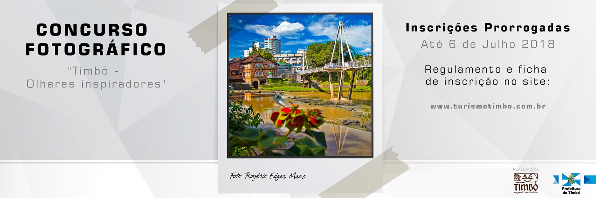 Fotógrafos profissionais e amadores têm mais uma chance de participar do Concurso Fotográfico Timbó Olhares Inspiradores. As inscrições gratuitas foram prorrogadas até o dia 06 de julho, e o material deve ser entregue pessoalmente na Fundação Cultural de Timbó. O Concurso tem a finalidade de estimular a prática da fotografia entre os timboenses e visitantes, e com a prorrogação queremos possibilitar que o maior número de pessoas participem, para compartilhar com todos o seu olhar sob Timbó, destacou Flávia Cipriani, diretora do Departamento de Turismo..