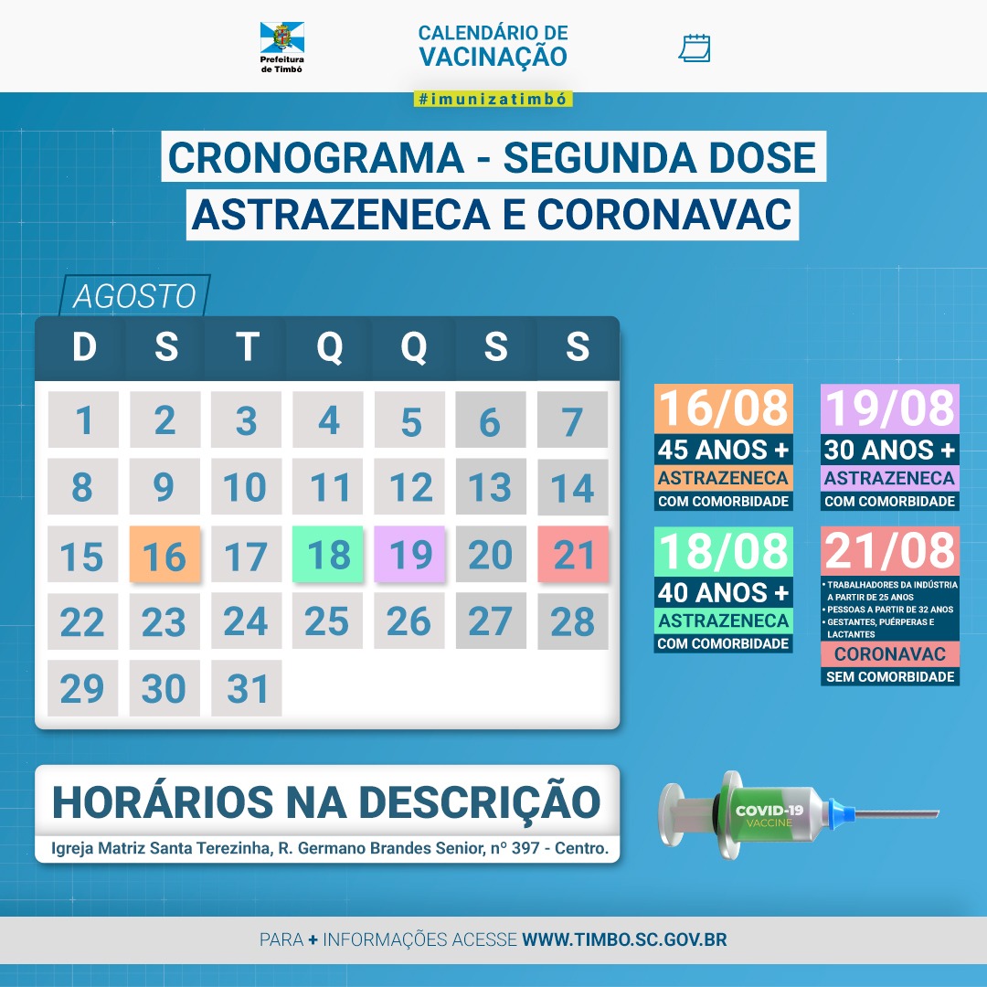 A Secretaria de Saúde informa que na próxima semana irá vacinar diversos grupos com a segunda dose da vacina contra Covid-19. Confira o cronograma completo abaixo.